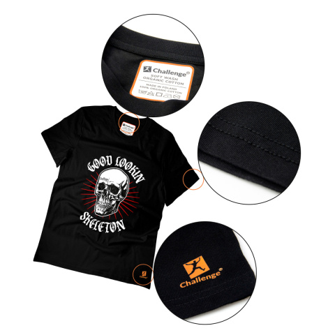- Logo marki Challenge w dolnym lewym roku koszulki. Znakowanie wykonane dzięki metodzie DTF