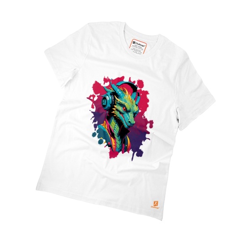 - Logo marki Challenge w dolnym lewym roku koszulki. Znakowanie wykonane dzięki metodzie DTF