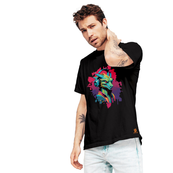 - Logo marki Challenge w dolnym lewym roku koszulki. Znakowanie wykonane dzięki metodzie DTF
