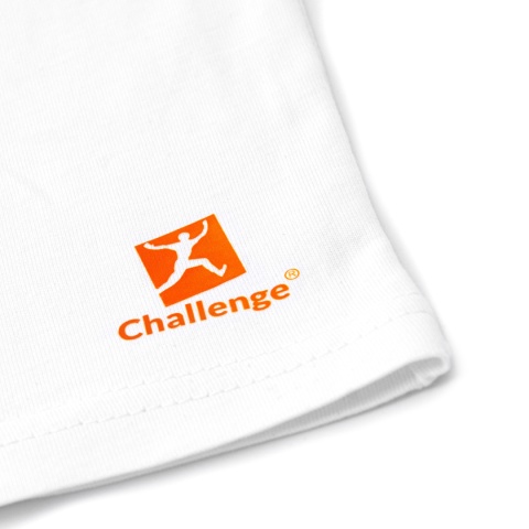 - Logo marki Challenge w dolnym lewym roku koszulki. Znakowanie wykonane dzięki metodzie DTF